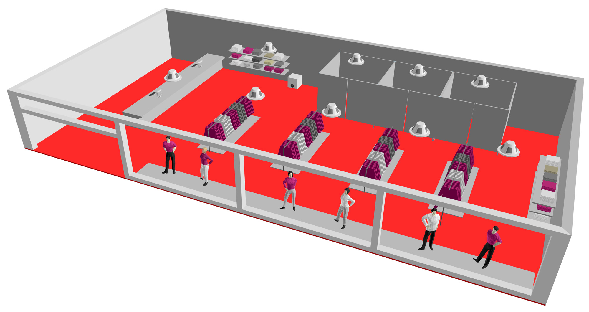 V případě hlasitého ozvučení musíme dbát na to, aby zvuk byl líbivý a výrazný. Navíc, efektní je, když toto ozvučení je nenápadné, ale dostatečně výkonné. Na základě provedení prodejny se rozhodneme, zda reproduktory budou na stěnách, nebo vestavěné v podhledovém stropě.